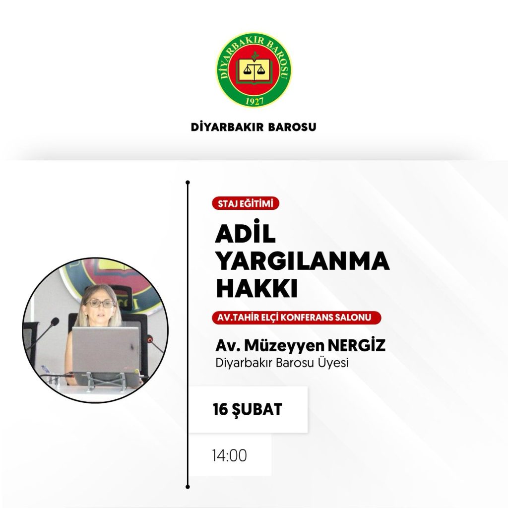 EtkinliklerEğitim Adil Yargılanma Hakkı Yazar Türkiye Hukuk - FacebookXWhatsAppLinkedinEmail Staj eğitimi, Diyarbakır Barosu tarafından düzenlenmektedir. Bunu paylaş: X'te paylaş (Yeni pencerede açılır) X Facebook üzerinde paylaş (Yeni pencerede açılır) Facebook LinkedIn'de paylaş (Yeni pencerede açılır) LinkedIn Arkadaşınıza e-posta ile bağlantı gönderin (Yeni pencerede açılır) E-posta