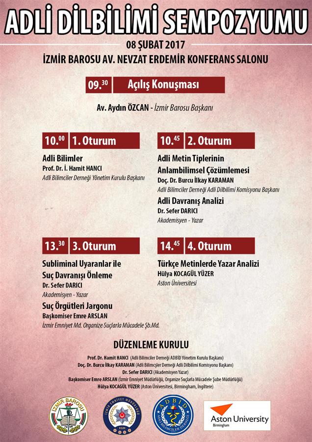 Adli Dilbilimi Sempozyumu İzmir Barosu, İzmir Emniyet Müdürlüğü, Adli Bilimciler Derneği (ADBİD) ve Aston Üniversitesi iş birliğiyle düzenlenmektedir.