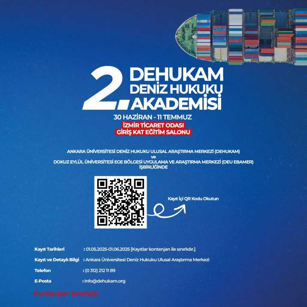 Ankara Üniversitesi Deniz Hukuku Ulusal Araştırma Merkezi (DEHUKAM) ve Dokuz Eylül Üniversitesi Ege Bölgesi Uygulama ve Araştırma Merkezi (DEU EBAMER) iş birliğinde düzenlenen “DEHUKAM Deniz Hukuku Akademisi” eğitim programı, 30 Haziran – 11 Temmuz 2025 tarihleri arasında İzmir Ticaret Odası Giriş Kat Eğitim Salonu’nda gerçekleştirilecek.