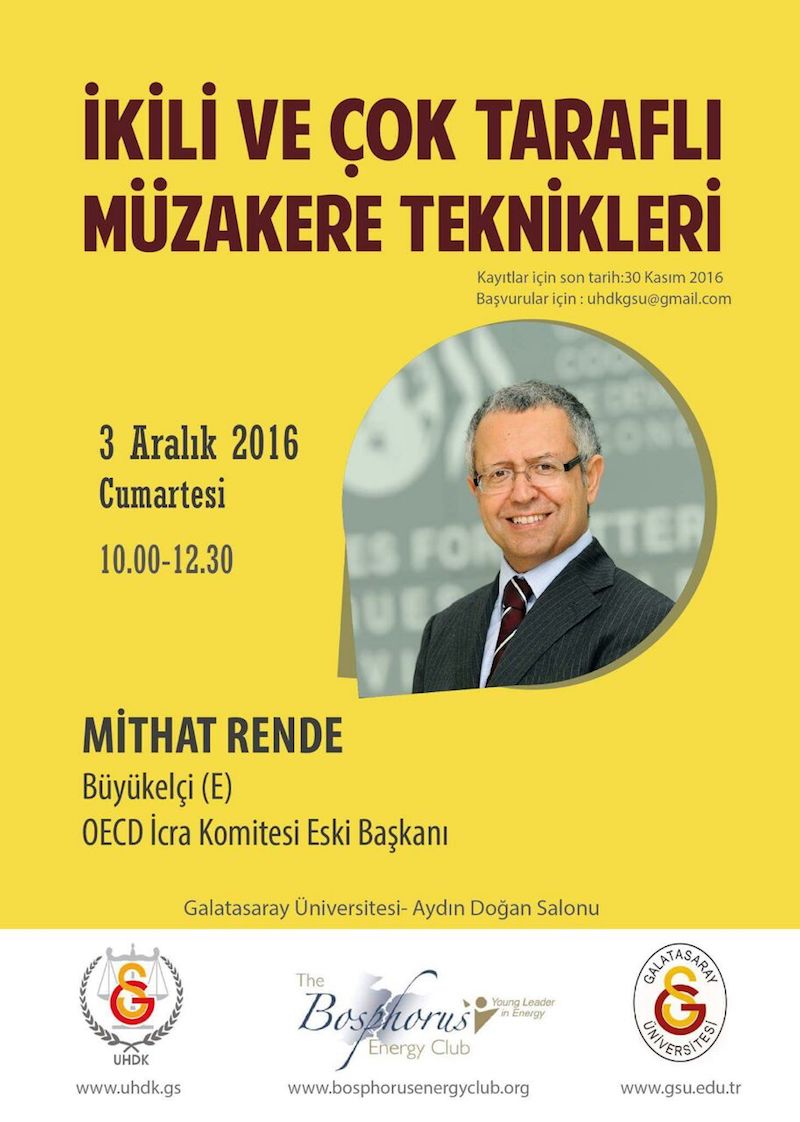 İkili ve Çok Taraflı Müzakere Teknikleri konulu söyleşi Galatasaray Üniversitesi Uluslararası Hukuk ve Diplomasi Kulübü ve Bosphorus Energy Club Young Leaders tarafından düzenlenmektedir.