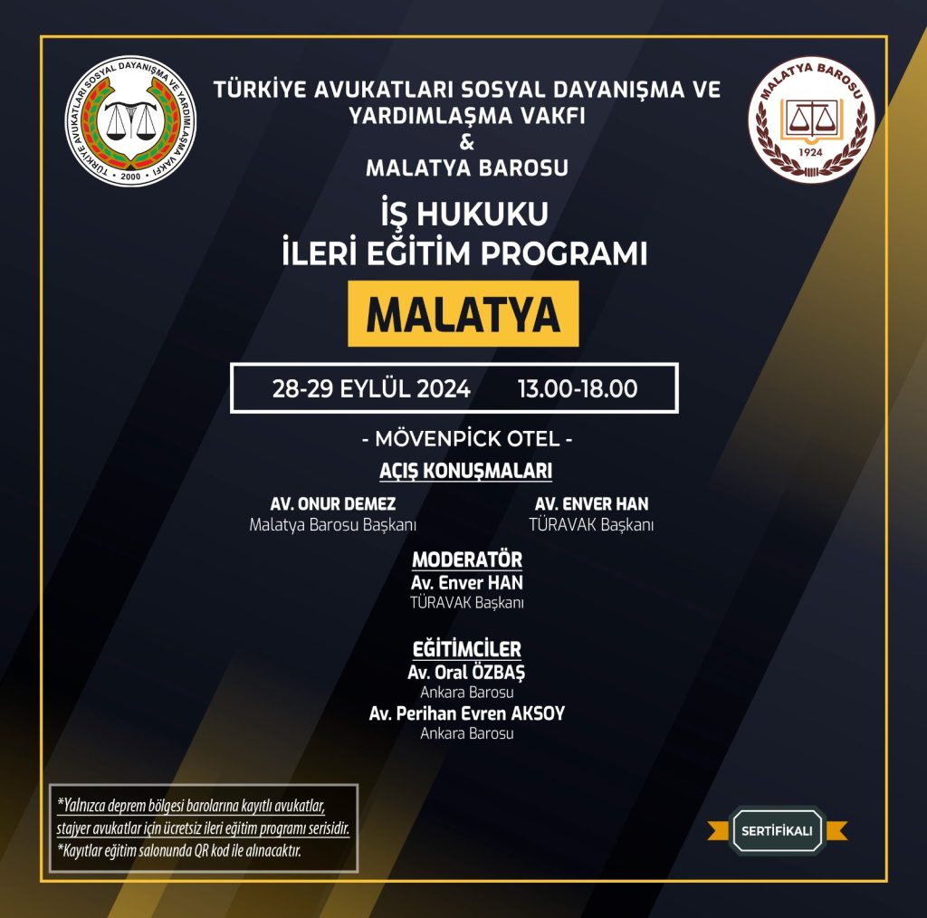EtkinliklerEğitim İş Hukuku İleri Eğitim Programı Yazar Türkiye Hukuk - FacebookXWhatsAppLinkedinEmail Eğitim, Türkiye Avukatları Sosyal Dayanışma ve Yardımlaşma Vakfı ile Malatya Barosu tarafından düzenlenmektedir. Bunu paylaş: X'te paylaş (Yeni pencerede açılır) X Facebook üzerinde paylaş (Yeni pencerede açılır) Facebook LinkedIn'de paylaş (Yeni pencerede açılır) LinkedIn Arkadaşınıza e-posta ile bağlantı gönderin (Yeni pencerede açılır) E-posta