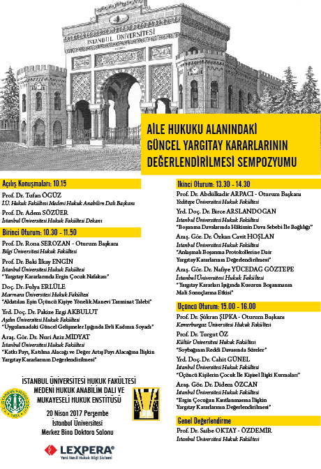 Aile Hukuku Alanındaki Güncel Yargıtay Kararlarının Değerlendirilmesi Sempozyumu, İstanbul Üniversitesi Hukuk Fakültesi Medeni Hukuk Ana Bilim Dalı ve Mukayeseli Hukuk Enstitüsü tarafından düzenlenmektedir.