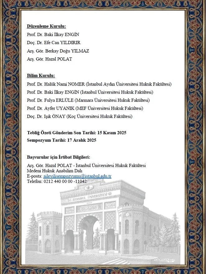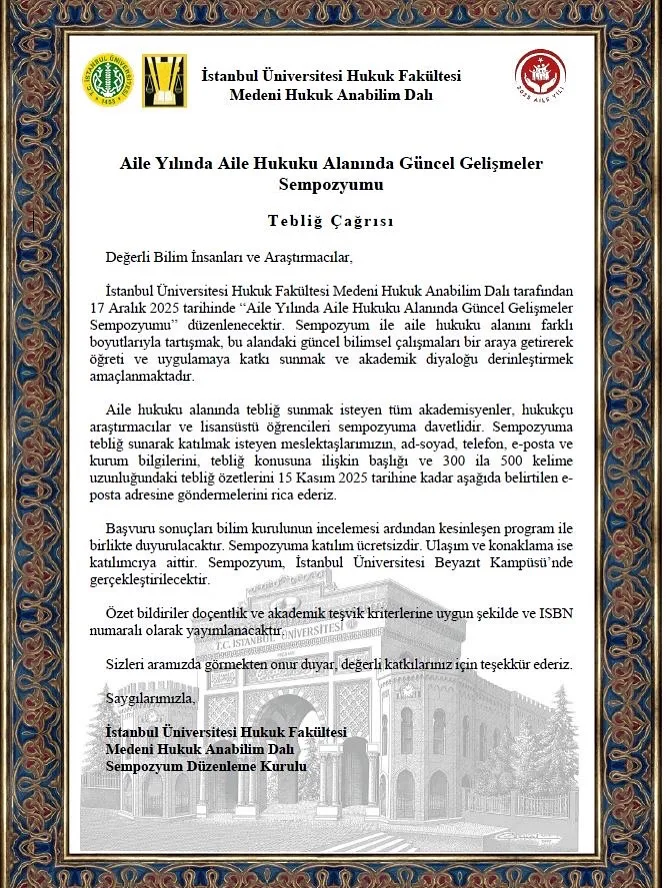 İstanbul Üniversitesi Hukuk Fakültesi Medeni Hukuk Ana Bilim Dalı, 2025 Aile Yılı kapsamında, aile hukukunun farklı boyutlarını ele almak üzere önemli bir bilimsel etkinliğe ev sahipliği yapmaya hazırlanıyor. 17 Aralık 2025 tarihinde İstanbul Üniversitesi Beyazıt Yerleşkesinde düzenlenecek “Aile Yılında Aile Hukuku Alanında Güncel Gelişmeler Sempozyumu” için tebliğ çağrısı yapıldı.