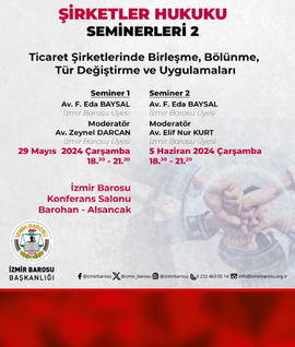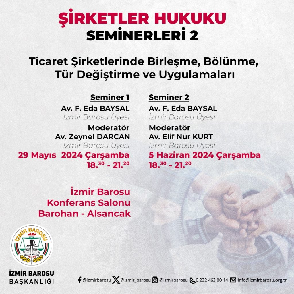 EtkinliklerSeminer Ticaret Şirketlerinde Birleşme, Bölünme, Tür Değiştirme ve Uygulamaları Yazar Türkiye Hukuk - FacebookXWhatsAppLinkedinEmail Seminer, İzmir Barosu tarafından düzenlenmektedir. Bunu paylaş: X'te paylaş (Yeni pencerede açılır) X Facebook üzerinde paylaş (Yeni pencerede açılır) Facebook LinkedIn'de paylaş (Yeni pencerede açılır) LinkedIn Arkadaşınıza e-posta ile bağlantı gönderin (Yeni pencerede açılır) E-posta