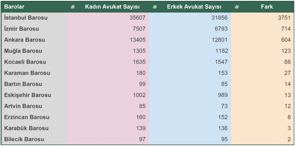 Cinsiyet dengesi açısından “ideal dengeyi” yakalayan barolar da mevcut. Sinop Barosu (99 Kadın – 101 Erkek) ve Bilecik Barosu (97 Kadın – 95 Erkek) sadece 2 kişilik farkla Türkiye’nin en dengeli dağılımına sahip baroları olarak öne çıkıyor.