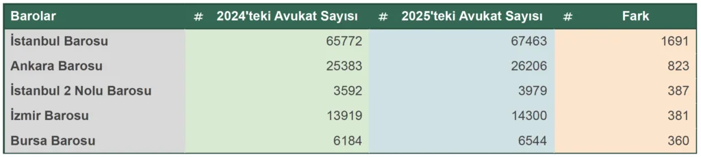 2025 yılında avukat sayısını en çok artıran beş baro, Türkiye’nin en büyük dört şehrinde yer alıyor. Listenin ilk sırasında yer alan İstanbul Barosu, son bir yılda tam 1.691 yeni avukat artışı yaşadı. Toplam sayısı ise 67.463 ulaştı.