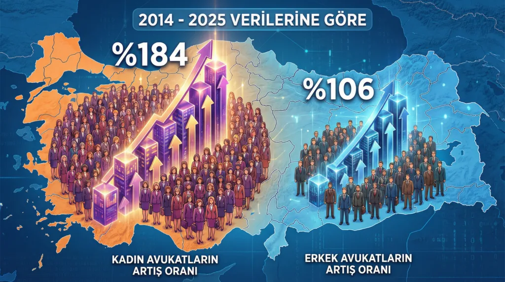 Analizimizin en dikkat çekici ayrıntısı, kadın avukat sayısındaki oransal artış. 2014-2025 yılları arasında kadın avukat sayısı yüzde 184 oranında artarken, erkek avukat sayısındaki artış yüzde 106 seviyesinde kaldı.