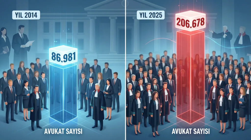 2014 yılında Türkiye genelinde barolara kayıtlı toplam avukat sayısı 86.981 iken, 2025 verileri bu sayının 206.678’e ulaştığını gösteriyor. Meslek, son 11 yılda yüzde 137 oranında bir büyüme kaydederek tarihî bir eşiği aşmış durumda.
