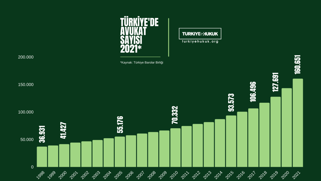 Türkiye Barolar Birliği (TBB) resmî kayıtlarına göre Türkiye’de barolara 1998 – 2021 yılları arasında 123 bin 720 yeni avukat kaydoldu. 2020 – 2021 yılları arasındaysa 17 bin 321 yeni avukat mesleğe adım attı. 2021 yılı sonu itibarıyla Türkiye’de 83 baroya kayıtlı toplam avukat sayısı 160 bin 651.