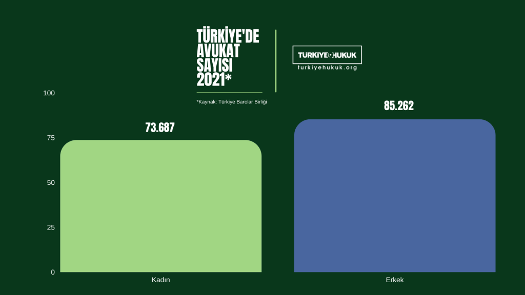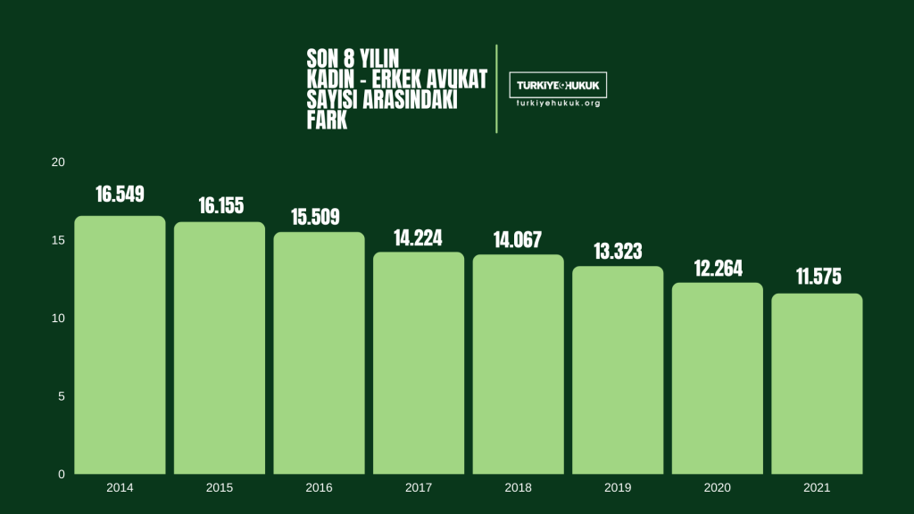 Türkiye geneli kadın – erkek avukat sayısı arasındaki fark her geçen yıl kapanıyor. Kadın – erkek avukat sayısı arasındaki fark 2014 yılında 16 bin 549’ken 2021 sonu itibarıyla 11 bin 575’e geriledi.