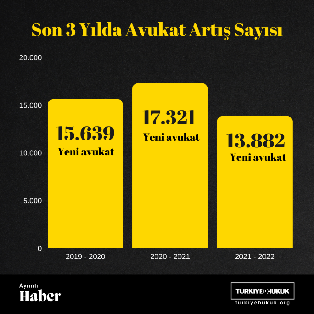 Türkiye Barolar Birliği (TBB) resmî kayıtlarına göre Türkiye’de son bir yılda 13 bin 882 yeni avukat, barolara kayıt yaptırarak mesleğe adım attı. Bu sayı, bir önceki yıl 17 bin 321’di. 2022 yılı sonu itibarıyla Türkiye’de 83 baroya kayıtlı toplam avukat sayısı 174 bin 533’e yükseldi.