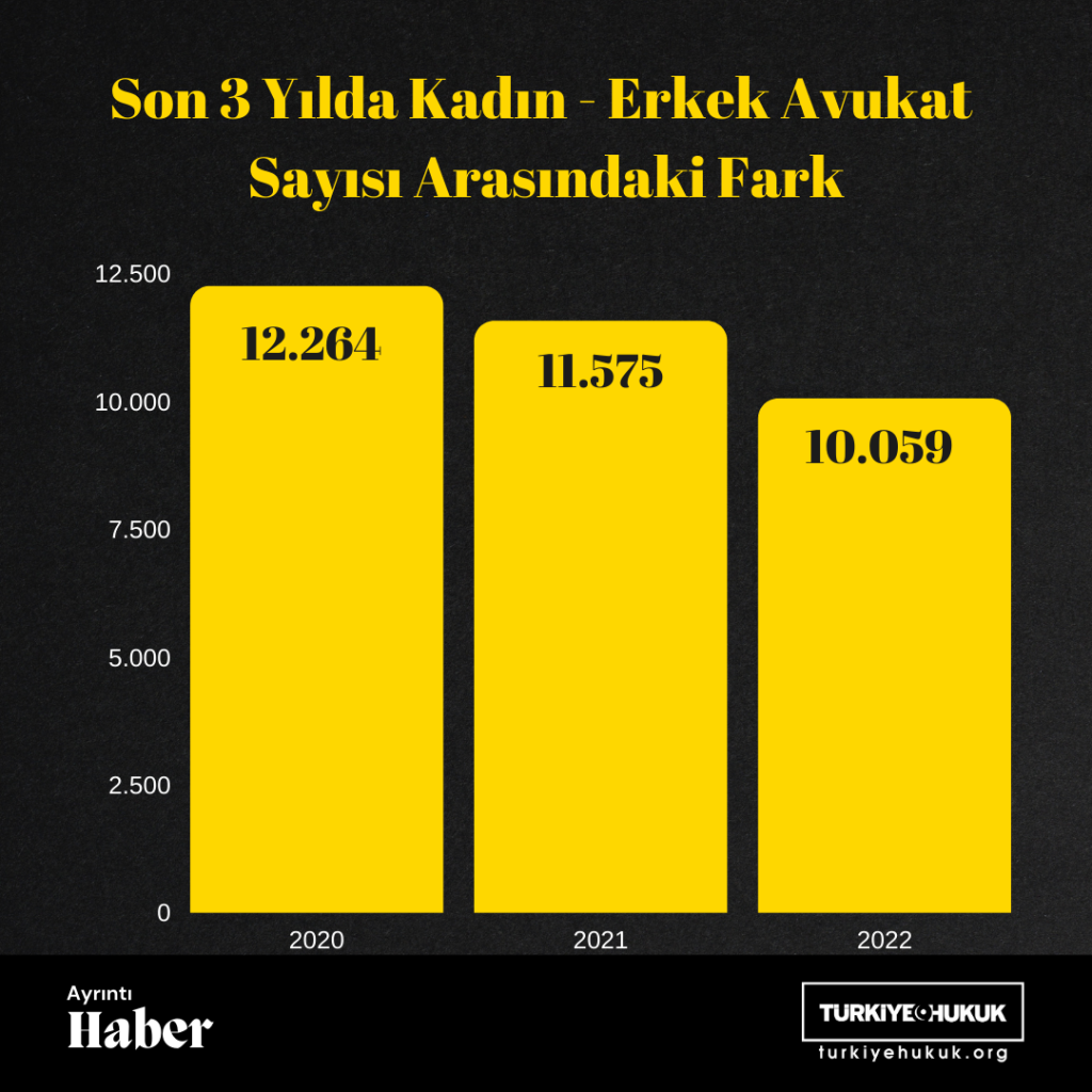 Mesleğe yeni başlayan avukatlar arasındaki kadın – erkek sayıları karşılaştırıldığında, kadın avukat sayısının her geçen yıl erkek avukat sayısına yaklaştığı görülmekte. Kadın – erkek avukat sayısı arasındaki fark 2020 yılında 12 bin 264’ken 2022 sonunda 10 bin 59’a geriledi.