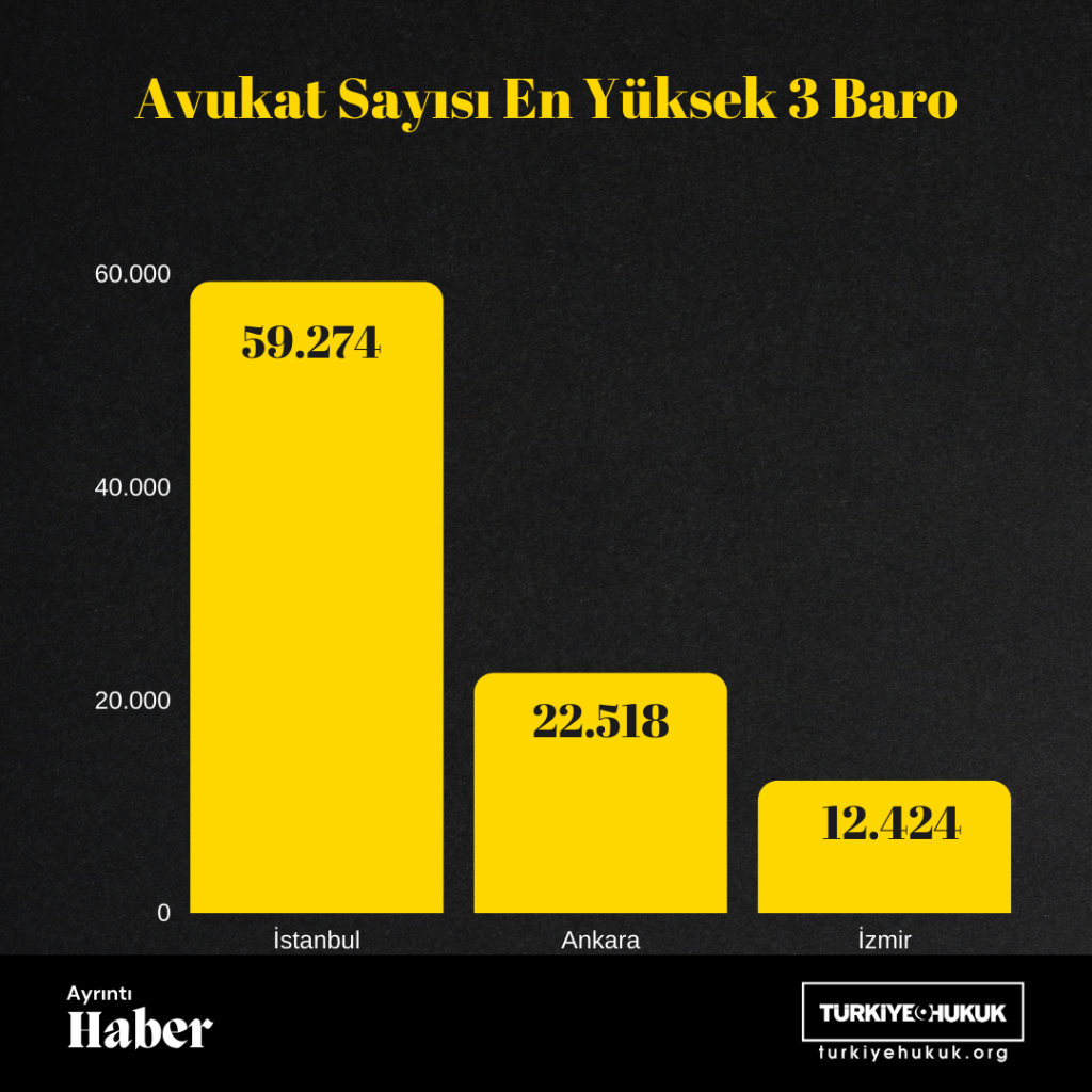 Kurulduğu yıldan beri Türkiye’nin en fazla kayıtlı avukata sahip barosu olan İstanbul Barosu, 2022 yılı sonu itibarıyla 59 bin 274 avukata ev sahipliği yapıyor. İstanbul Barosunu, 22 bin 518 kayıtlı avukatla Ankara Barosu, 12 bin 424 kayıtlı avukatla İzmir Barosu takip ediyor.