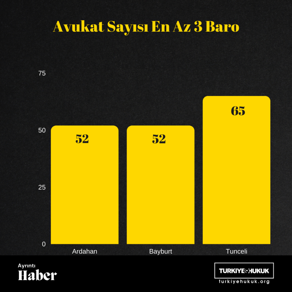 52 kayıtlı avukat sayısıyla Ardahan ve Bayburt Baroları, 83 baro arasında avukat sayısında son sırada yer almakta. Ardahan Barosu, bir önceki yıl 54 avukata sahipken 2022’nin sonunda bünyesindeki avukat sayısı 52’ye düştü. Bayburt Barosunun bir önceki yıl kayıtlı avukat sayısıysa 47’ydi. Diğer yandan 65 kayıtlı avukat sayısıyla Tunceli Barosu, 77 kayıtlı avukat sayısıyla Gümüşhane Barosu, listenin sonunda yer almakta.