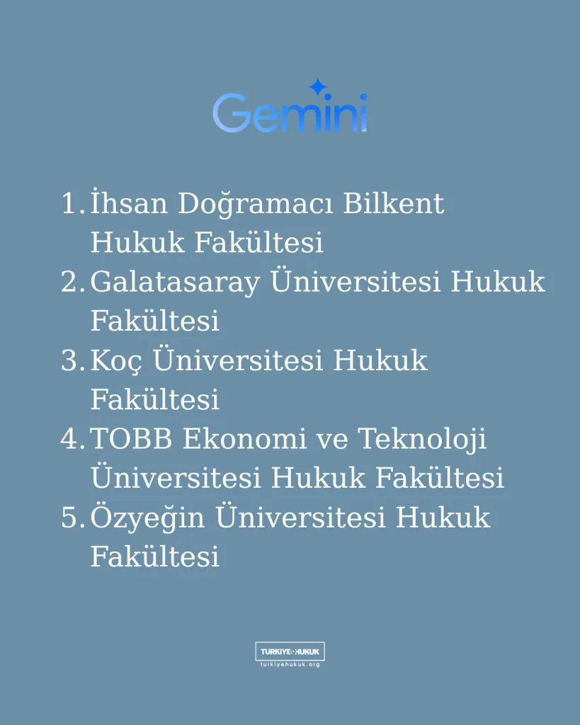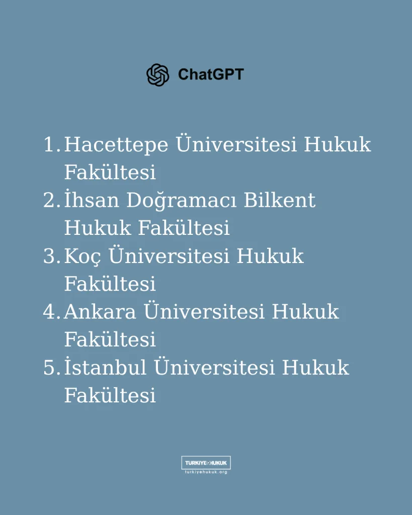 Yukarıdaki analizler sonrasında yapay zeka modellerinden, en değerli gördükleri üç hukuk fakültesini sebepleriyle birlikte sıralamaları istendi. Modeller, hukuk fakültelerini eğitim kalitesi, akademik kadro, bilimsel üretkenlik, öğrenci/mezun memnuniyeti, yenilikçi eğitim yaklaşımları ve mezun başarıları yönünden ele alarak radarlarındaki ilk üç hukuk fakültesini sıraladı: