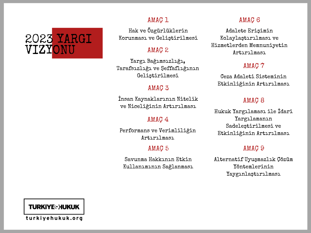 Adalet Bakanlığı tarafından hazırlandı ve 30 Mayıs 2019 tarihinde Cumhurbaşkanı Recep Tayyip Erdoğan tarafından “2023 Yargı Vizyonu – Güven Veren ve Erişilebilir Bir Yargı Sistemi” başlığıyla açıklan Yargı Reformu 3. Strateji Belgesi toplam 9 amaçtan oluşmakta.